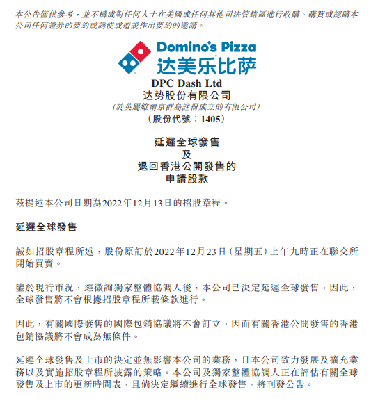 大公快消讯 12月19日,达美乐比萨中国特许经营商达势股份发布公告,延迟全球发售,退回香港公开发售的申请股款。
