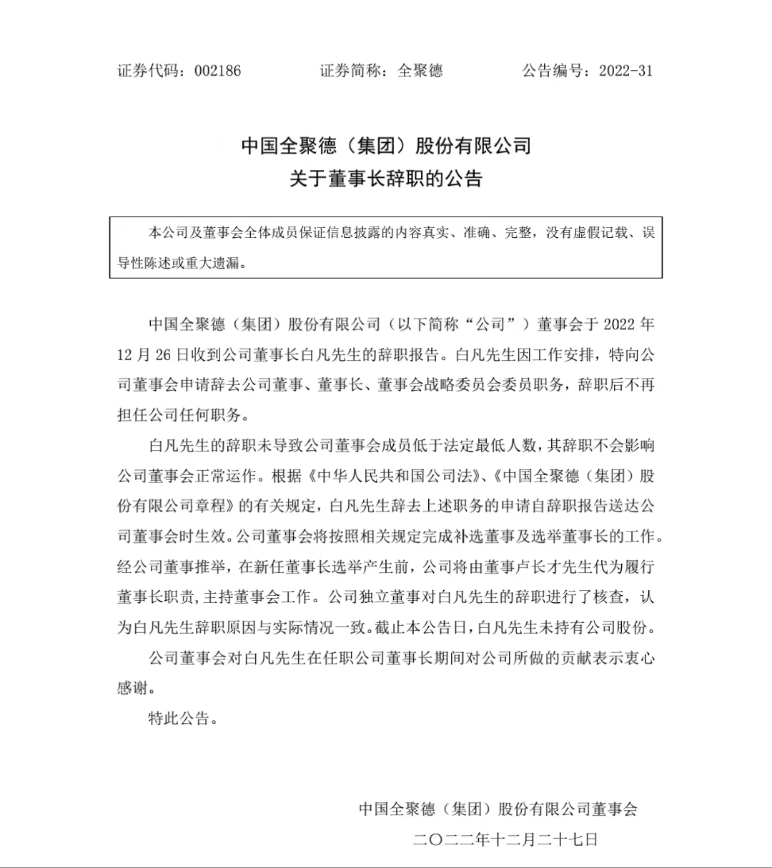大公快消讯 中国全聚德(集团)股份有限公司(以下简称“全聚德”)12月27日发布公告称,公司董事会于2022年12月26日收到公司董事长白凡的辞职报告。