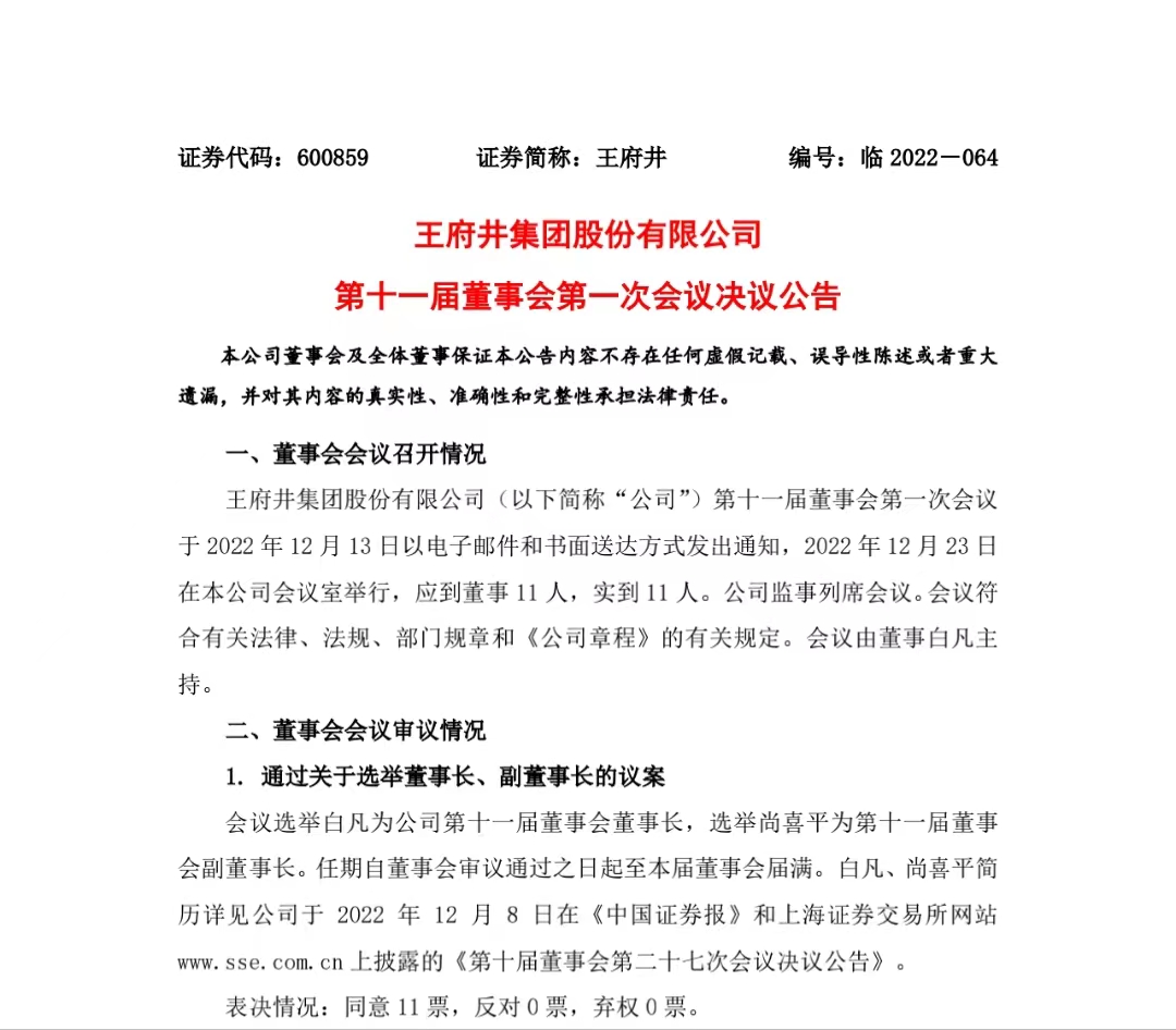 而白凡目前已履新王府井,根据12月23日王府井发布的《第十一届董事会第一次会议决议公告》显示,会议通过关于选举董事长、副董事长的议案,选举白凡为该公司第十一届董事会董事长,任期三年。