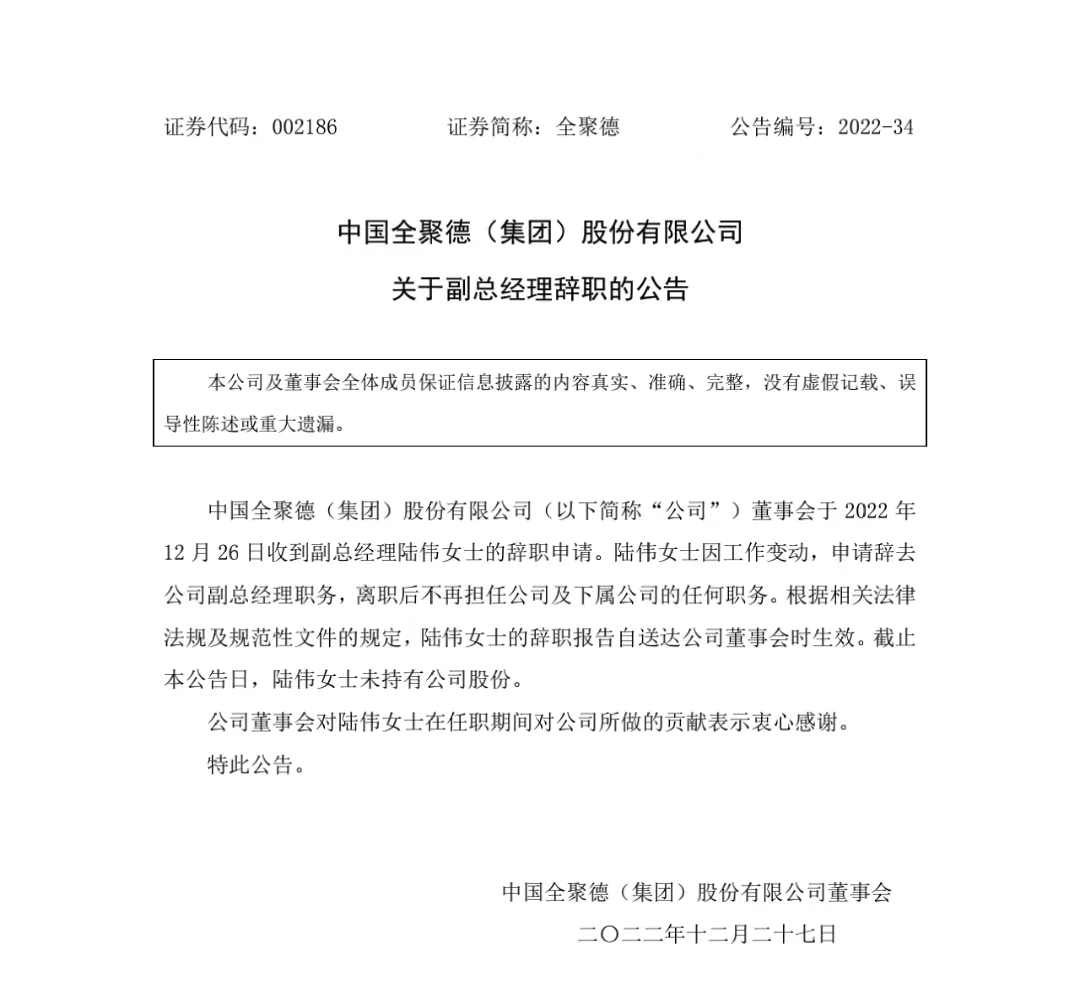 与此同时,全聚德同日发布的另一则公告称,董事会于12月26日收到副总经理陆伟的辞职申请。陆伟因工作变动,申请辞去公司副总经理职务,离职后不再担任公司及下属公司的任何职务。