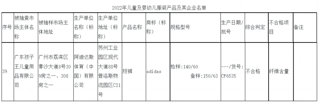据抽查公告显示,2022年第二季度,广州市市场监督管理局对儿童及婴幼儿的服装产品质量进行监督抽查,总共抽取了45批次的样品,经过检验,有7批次产品不符合标准。其中包括阿迪达斯体育(中国)有限公司(以下简称“阿迪达斯”)生产的货号为CF65356的产品,理由为纤维含量不合格。