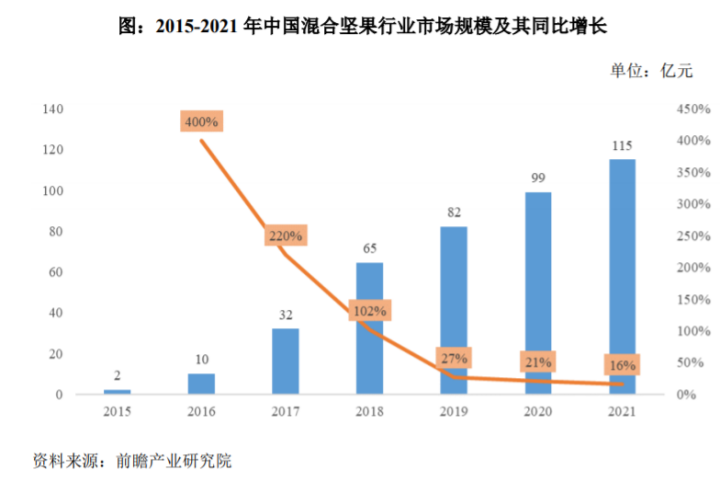 另据前瞻产业研究院数据,我国混合坚果行业2015-2021年市场规模整体保持较快增长的态势;2020年我国混合坚果行业市场规模约为99亿元,同比增长21%;2021年我国混合坚果行业市场规模约为115亿元,同比增长16%。