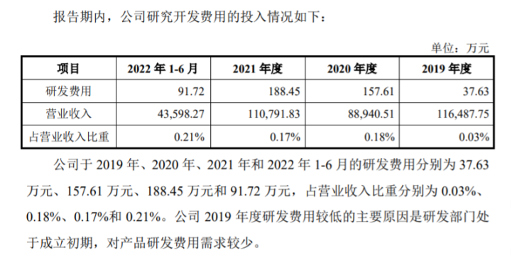 除此之外,大公快消还注意到,沃隆食品在产品研发上的投入远低于同类型企业。2019年、2020年、2021年及截至2022年6月30日,公司研发投入分别为37.63万元、157.61万元、188.45万元、91.72亿元,占营收比重分别为0.03%、0.18%、0.17%、0.21%。