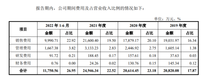 但大手笔营销背后,是沃隆食品逐年增长的销售费用。招股书显示,2019年、2020年、2021年,公司销售费用分别为1.9亿元、1.79亿元、2.16亿元,占营收比例16.34%、20.10%、19.50%。截至2022年6月30日,这一数据约为9990.71万元,占营收比例22.92%。