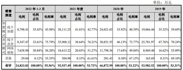 2019年至2022年一季度,八马茶业来自加盟店的销售金额分别为4.80亿元、5.9亿元、8.91亿元和2亿元,毛利率分别为39.69%、40.39%、42.77%和43.98%,占当期主营业务收入的比例分别为47.44%、47.33%、51.50%和44.76%。
