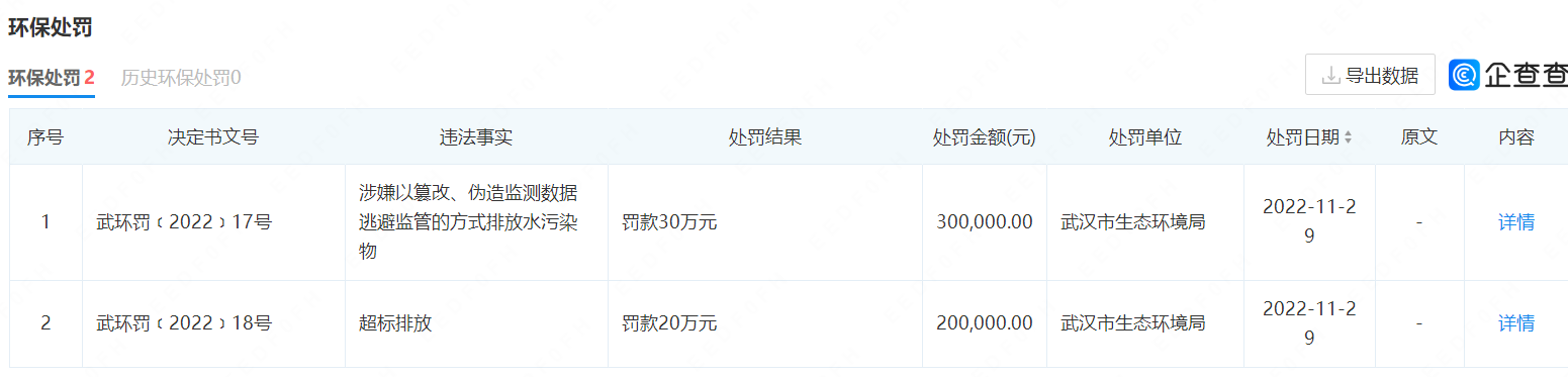 企查查显示,2022年11月29日,武汉顶峰因涉嫌以篡改、伪造监测数据逃避监管的方式排放水污染物,被武汉市生态环境局处以30万元罚款,同时,该公司还因超标排放被武汉市生态环境局处以20万元罚款。