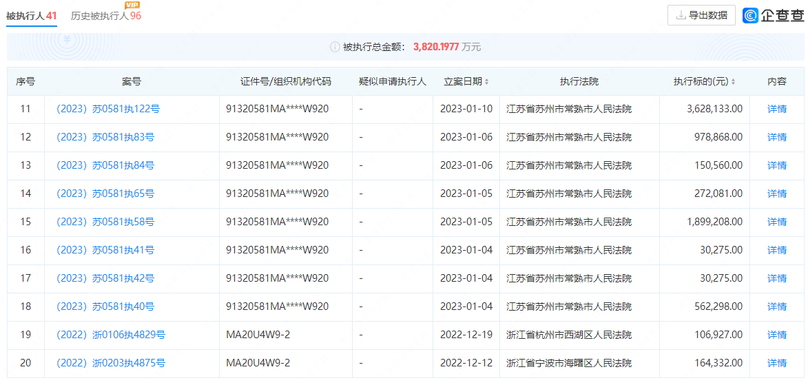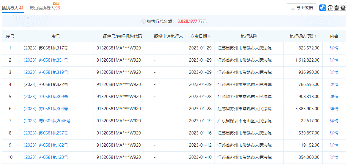 大公快消讯 据企查查显示,近日,常熟每日优鲜电子商务有限公司(以下简称“常熟每日优鲜”)新增多则被执行人信息,累计被执行金额约3820.2万元。