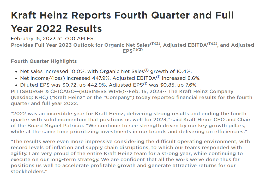 大公快消讯 2月15日美国东部时间上午,美国食品巨头卡夫亨氏发布2022年第四季度和全年业绩报告。