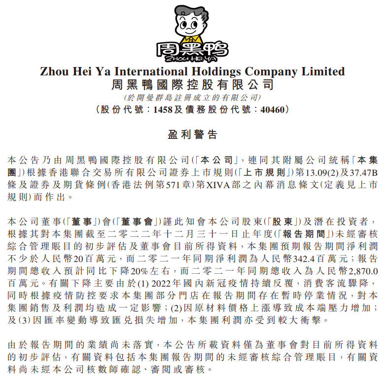 2月13日晚间,周黑鸭国际控股有限公司发布盈利警告。