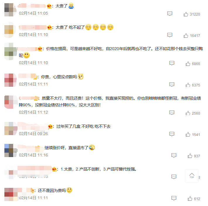 2月16日当晚,"周黑鸭业绩大降超90%"的词条登上微博热搜。大公快消在相关的微博评论中发现,网友们都在直指周黑鸭业绩下降的致命点,"贵"。还有网友指出周黑鸭日渐落伍的原因,"1.太贵,2.产品不创新,3.产品可替代性强。"