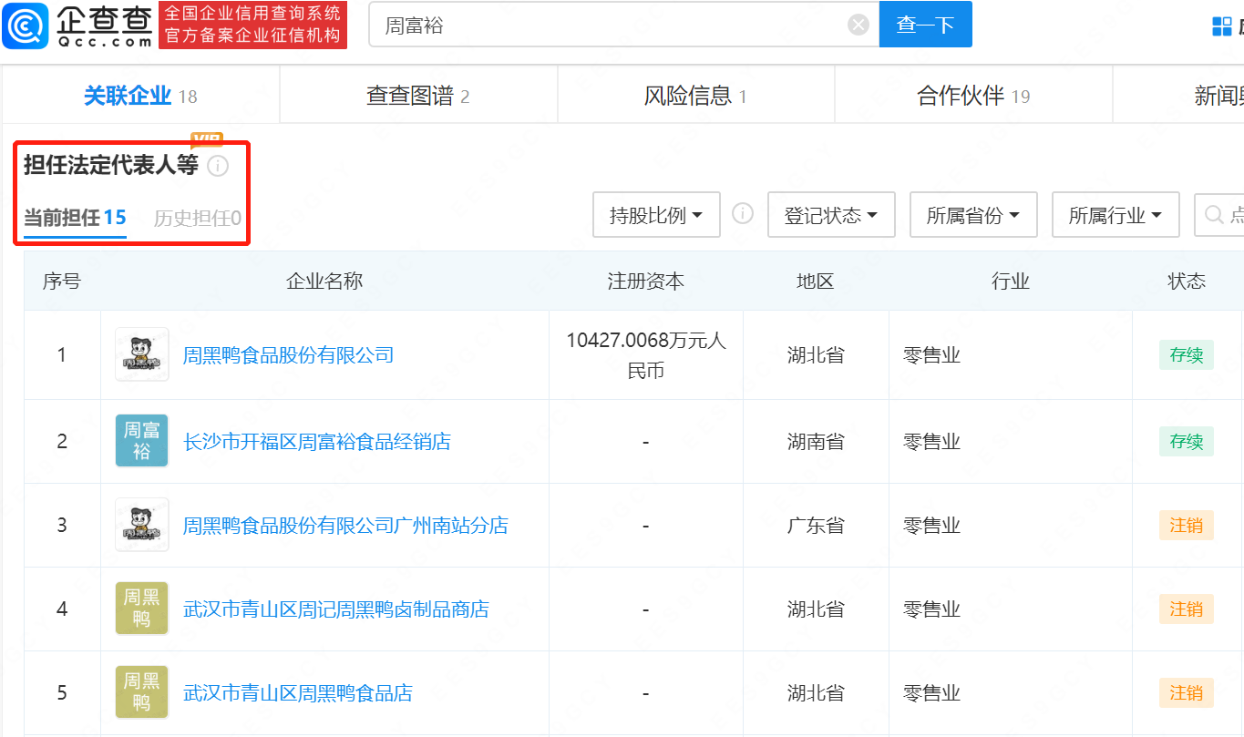 值得一提的是,周黑鸭掉落神坛早有预告。企查查显示,周黑鸭创始人周富裕目前在内地担任15家企业法定代表人,其中13家企业已注销,注销的多是周黑鸭的各地区门店。