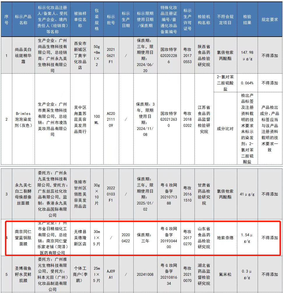近日,国家药监局官网通报了19批次化妆品被检出禁用原料,其中“南京同仁堂蓝铜肽面膜”赫然在列。