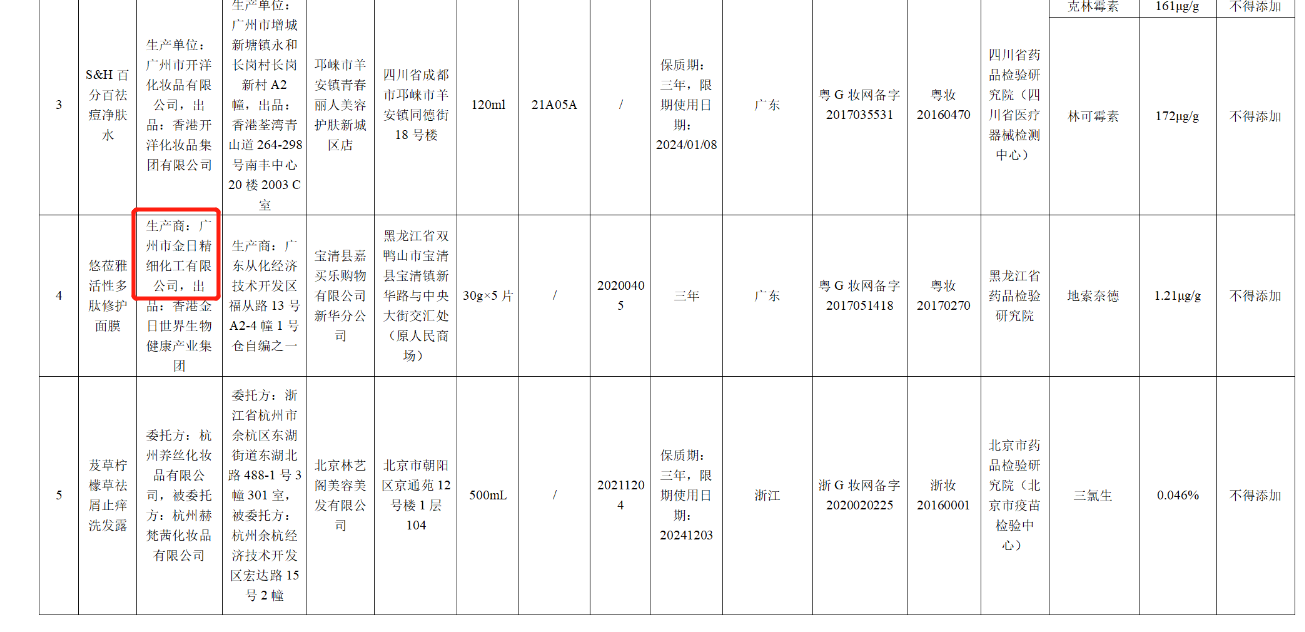 大公快消注意到,就在今年的1月31日,于国家药监局发布的《关于13批次化妆品检出禁用原料的通告》中,标示为广州金日生产的“悠莅雅活性多肽修护面膜”同样被检出含有禁用原料地索奈德(含量为1.21μg/g)。也就是说,广州金日因生产含有禁用原料的化妆品,已在一个月的时间内两次遭到国家药监局公开点名通报。