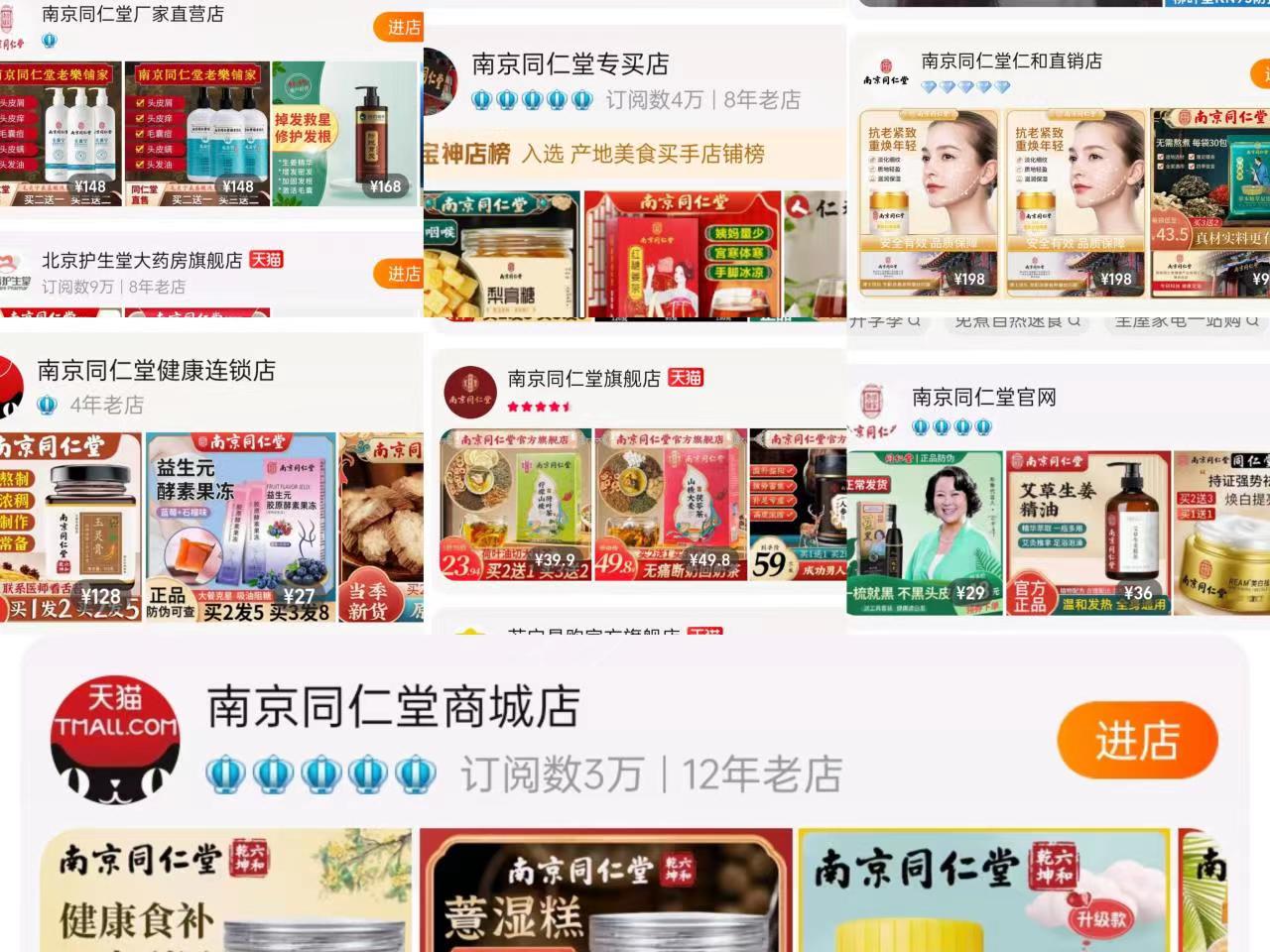 大公快消在电商平台上搜索关键词“南京同仁堂”,产品从药品、食品、保健品到妆字号产品均有涉及,如养生茶、阿胶糕、黄芪颗粒、生姜防脱洗发水等。而相应店铺从南京同仁堂官方官网企业店、南京同仁堂商城店,到南京同仁堂官网、南京同仁堂健康连锁店,再到南京同仁堂严选、同仁堂茶艺馆、南京同仁堂线上推广总店等更是纷繁。