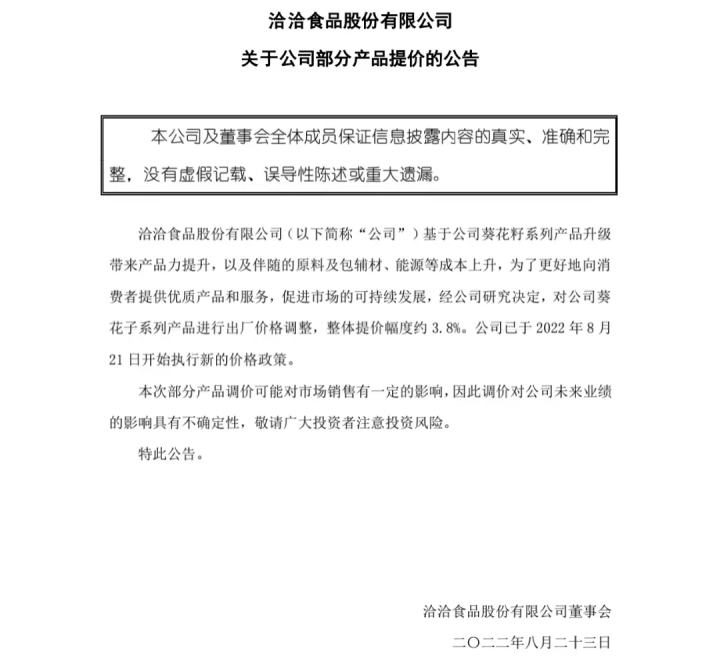 2022年8月24日,洽洽食品发布提价公告称,基于公司葵花籽系列产品升级带来产品力提升,以及伴随的原料及包辅材、能源等成本上升,为了更好地向消费者提供优质产品和服务,促进市场的可持续发展,经公司研究决定,对公司葵花籽系列产品进行出厂价格调整,整体提价幅度约3.8%。