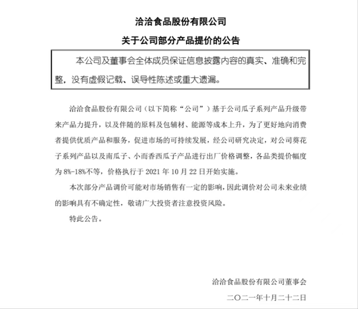 而此次提价距离洽洽食品上次提价却不足一年。2021年10月22日洽洽食品已针对葵花籽系列产品以及南瓜子、小而香西瓜子产品发布过一次提价公告,各品类提价幅度为8%-18%不等。