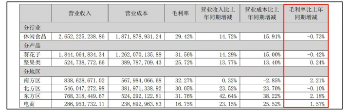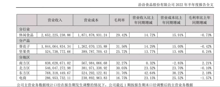 根据2022年中报数据显示,洽洽食品的葵花子销售收入仍占到整体营业收入的68.86%,然而与上年同期相比,洽洽食品葵花子的营收虽增长14.29%,但毛利率反而下降了0.42%。