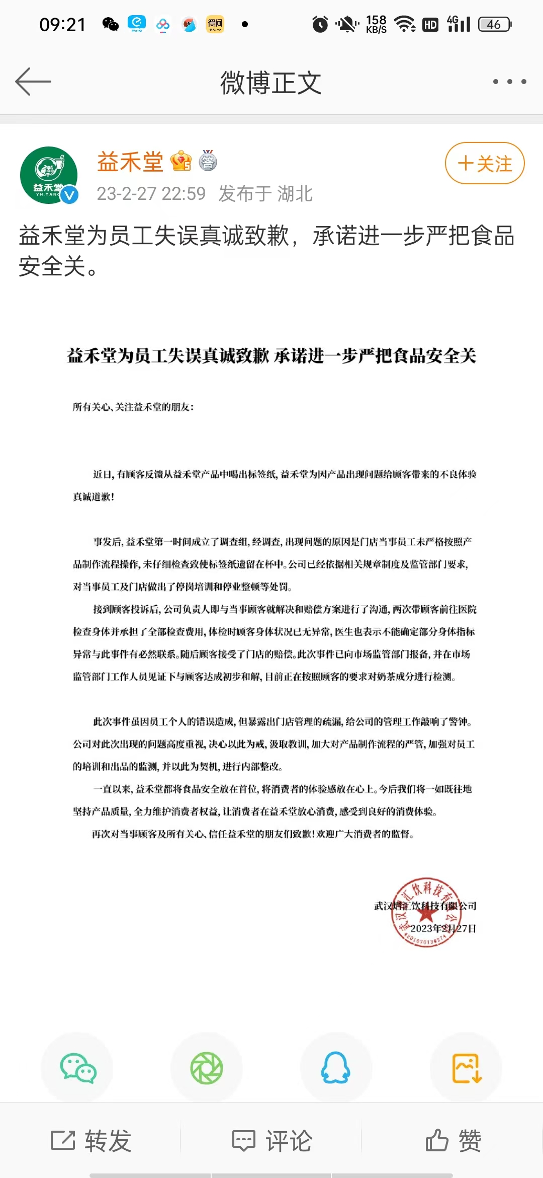 益禾堂方面则表示,事发后益禾堂第一时间成立了调查组,经调查出现问题的原因是门店当事员工未严格按照产品制作流程操作,未仔细检查致使标签纸遗留在杯中。公司已经依据相关规章制度及监管部门要求对当事员工及门店做出了停岗培训和停业整顿等处罚。