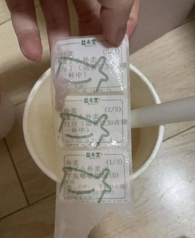 据了解,2月19日,广东深圳一消费者用平台折扣活动付款5毛后买下一杯益禾堂热奶茶,送达后喝到一半发现3个本应贴在杯子外部的标签都被浸泡在奶茶里。该消费者发现标签都已经泡褪色了,怀疑益禾堂不想做活动蓄意报复。