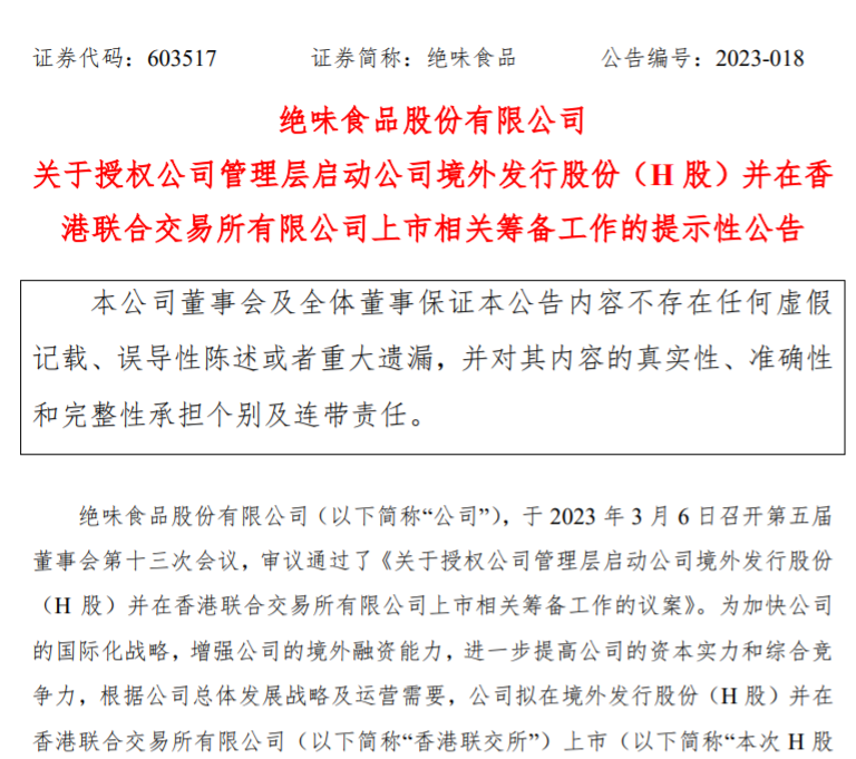 大公快消讯 3月7日,绝味食品发布关于授权公司管理层启动公司境外发行股份(H股)并在香港联合交易所有限公司上市相关筹备工作的提示性公告。