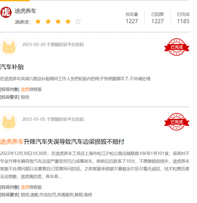 在黑猫投诉平台,截至2023年2月28日,关于途虎养车的投诉数量共计1227件,大部分问题集中在服务态度不好、操作不当、商品质量差、以次充好、宣传活动无法兑现等。