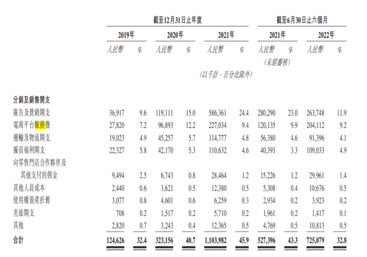 在分销及销售开支部分,占比最高的就是广告及营销开支,于2019年、2020年、2021年及2022年6月30日止六个月,该部分占收入的百分比分别为9.6%、15.0%、24.4%及11.9%。