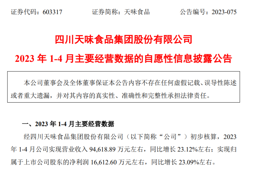 大公快消讯 5月22日,四川天味食品集团股份有限公司(证券代码:603317,证券简称:天味食品)发布2023年1-4月主要经营数据的自愿性信息披露公告。
