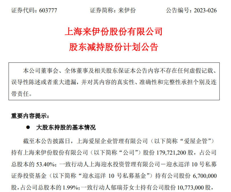 根据5月4日晚间来伊份发布的公告可知,爱屋企管拟通过包括但不限于集中竞价交易、大宗交易等方式减持其持有的公司股份(来源于首次公开发行前已持有的股份及其权益分派转增股)合计不超过约1009.68万股,即不超过公司总股本的3%。