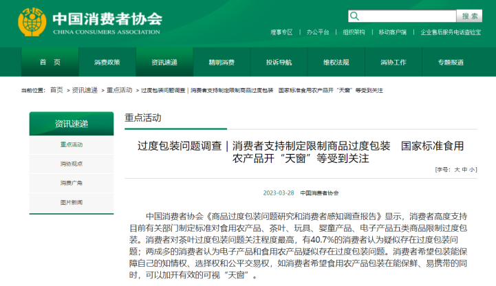 今年3月末,中国消费者协会曾发布《商品过度包装问题研究和消费者感知调查报告》。彼时,中消协对消费者关注度最高的茶叶包装问题进行调查发现,有40.7%的消费者认为疑似存在过度包装问题;两成多的消费者认为电子产品和食用农产品疑似存在过度包装问题。最终结论显示,有超八成消费者反对过度包装;超九成消费者不熟悉商品过度包装的判别标准。