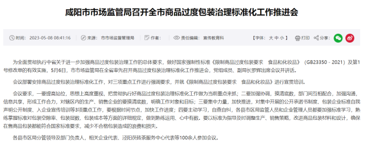 咸阳市市场监管局官网显示,会议上,咸阳市监局表示,要以标准为指导及时调整生产、销售策略,改进商品包装材料和设计,确保在售商品包装都能符合国家标准要求,减少不合格包装造成的浪费和损失。