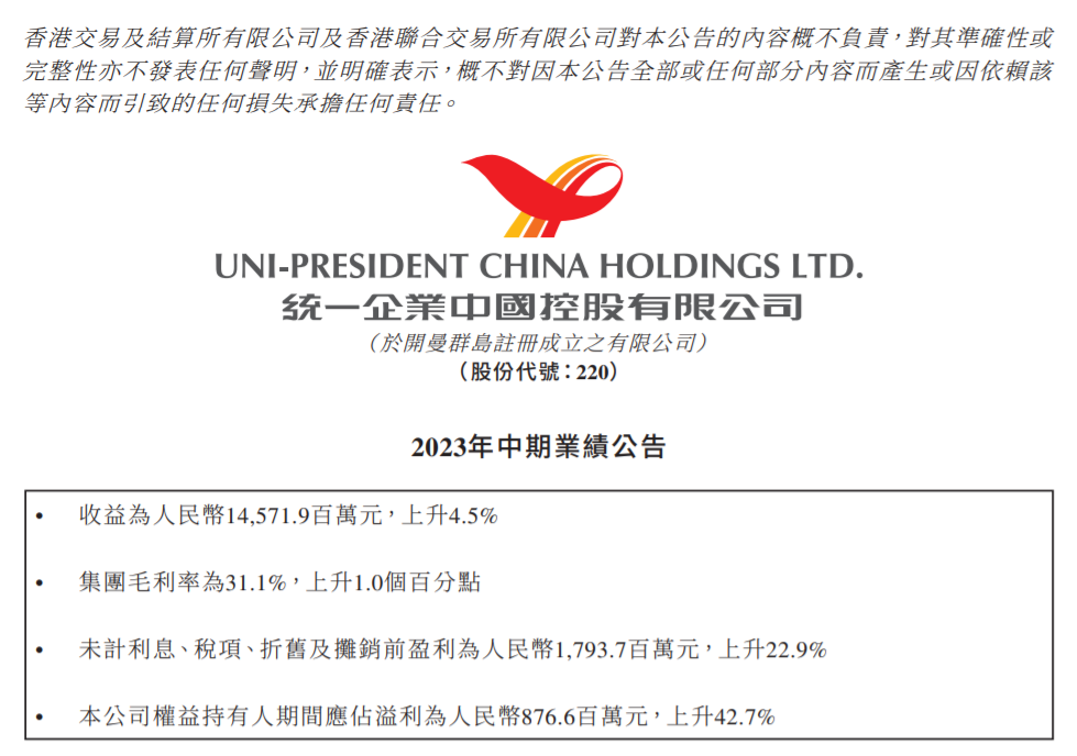 这一情况也直接体现在众多快消领域企业的财务数据上。比如中国知名饮料及方便面制造商统一企业中国控股有限公司(股份代号:00220.HK),上半年营收145.72亿元,同比增长4.5%;经营溢利10.92亿元,同比增长49.4%;毛利45.33亿元,同比增长8%;毛利率上升一个百分点至31.1%。