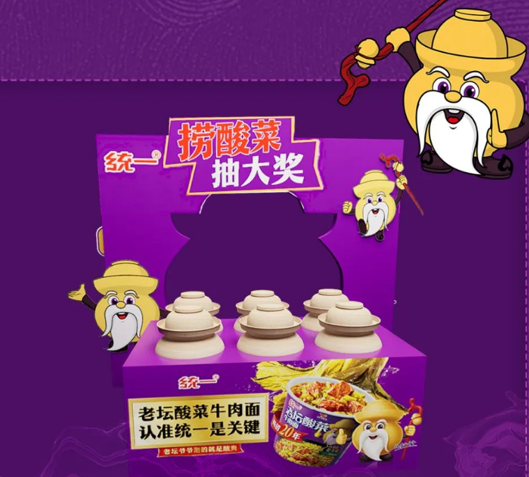 与此同时,统一还重做了同质化十分严重的老坛酸菜牛肉面。从该产品推出的新包装上可以看到,统一除了推出全新IP形象“老坛爷爷”,还在活动中提出了“老坛酸菜牛肉面,认准统一是关键”的内容。