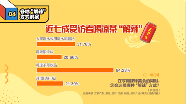 在解辣方式上,超六成的消费者认为喝王老吉是解辣首选,王老吉成为了各种辣菜的“最佳伴侣”。