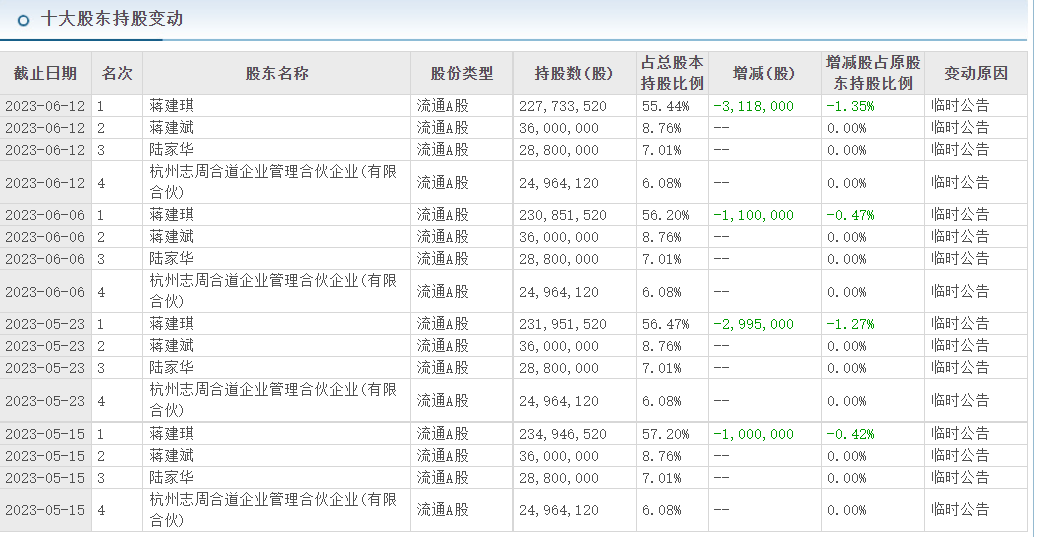通过东方财富可以看到,5月15日、23日,蒋建琪以大宗交易形式分别减持股票100万股、299.5万股,并在6月6日、12日再次减持110万股、311.8万股,累计减持821.3万股,持股比例从56.47%下降到了55.44%。