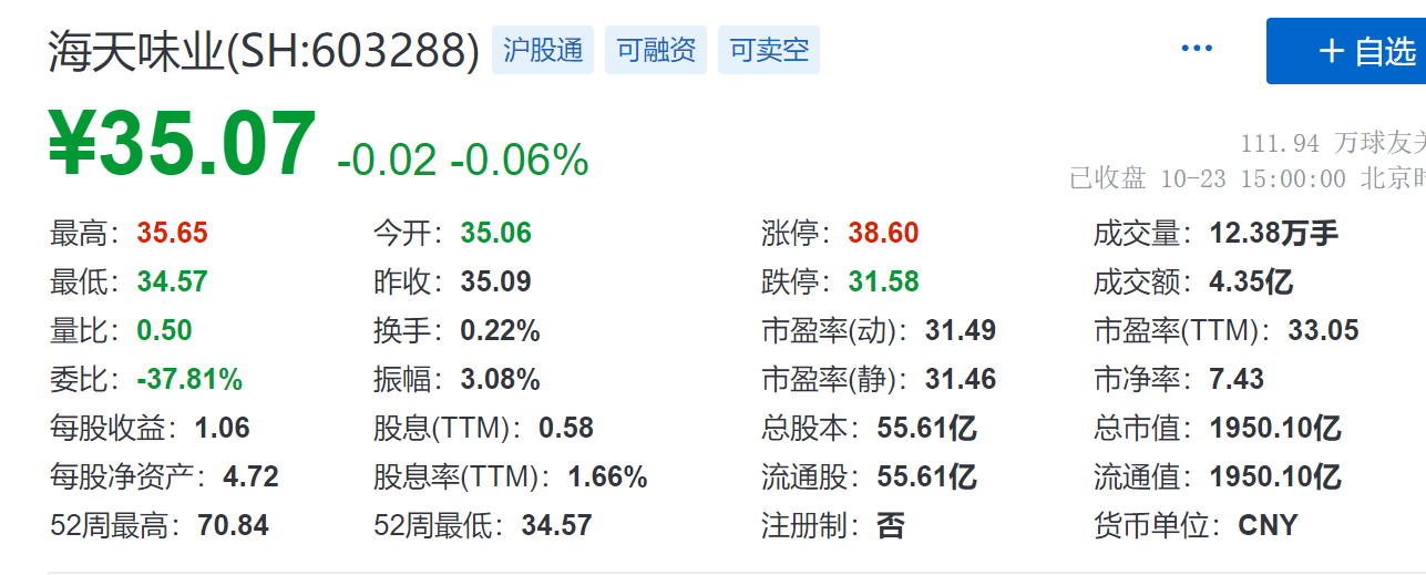 今年以来,“酱茅”海天味业的市值不断蒸发,股价更是一路下跌,累计下跌45%左右,近乎腰斩。截至2023年10月23日,海天味业股价已跌至35.07元。总市值跌至1950.1亿元,与2021年海天味业突破7000亿市值相比,市值蒸发超5000亿元。