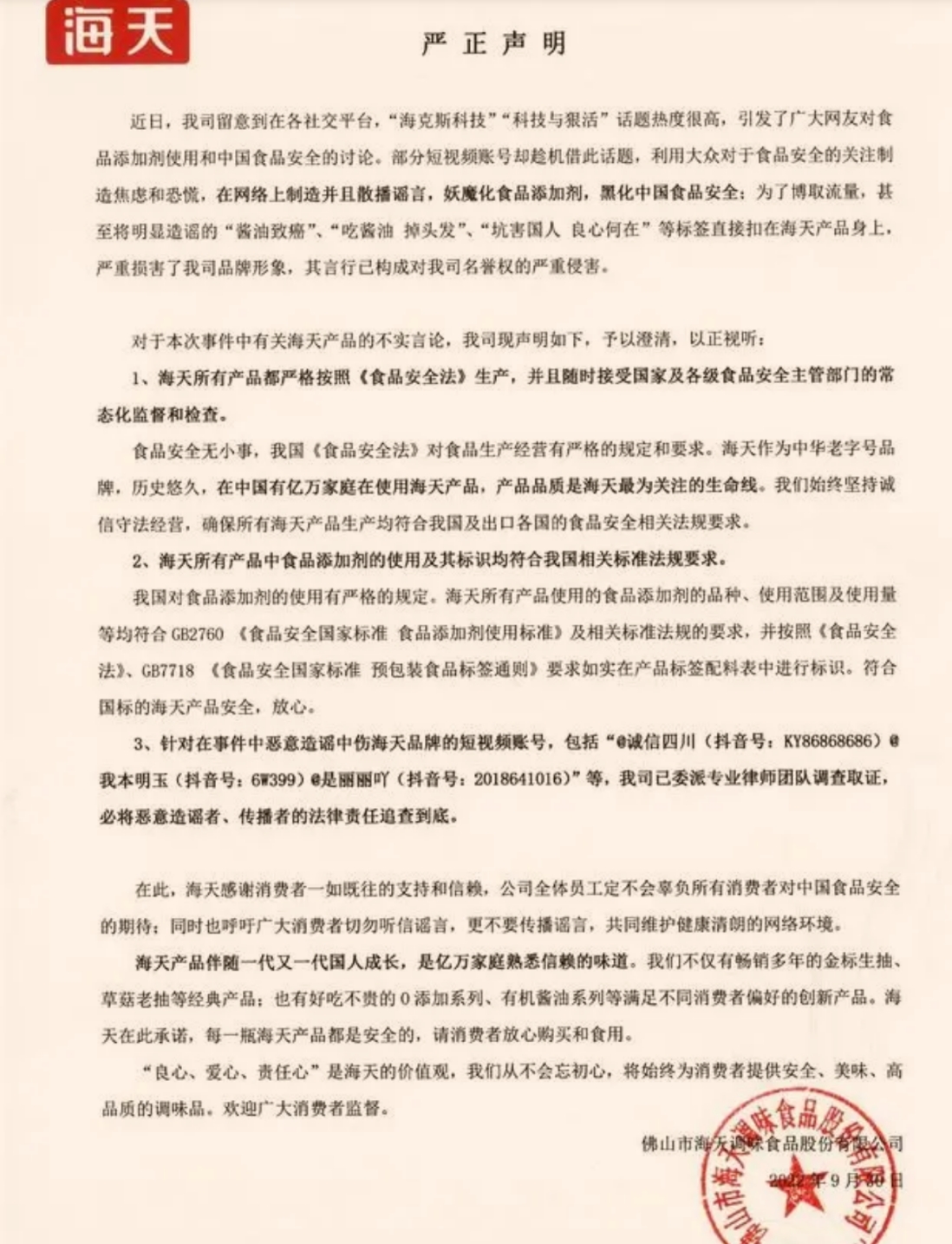 同日,中国调味品协会也发布声明称,国庆节期间,一则关于海天酱油等产品国内外“双标”的传言在网上疯传,对节日餐饮业和调味品市场造成严重影响。此次事件的发生,对中国调味品的生产和市场造成了不良影响,我们对此深表遗憾,并支持因舆情受到影响的调味品企业依法维权,追究网络造谣者的法律责任。