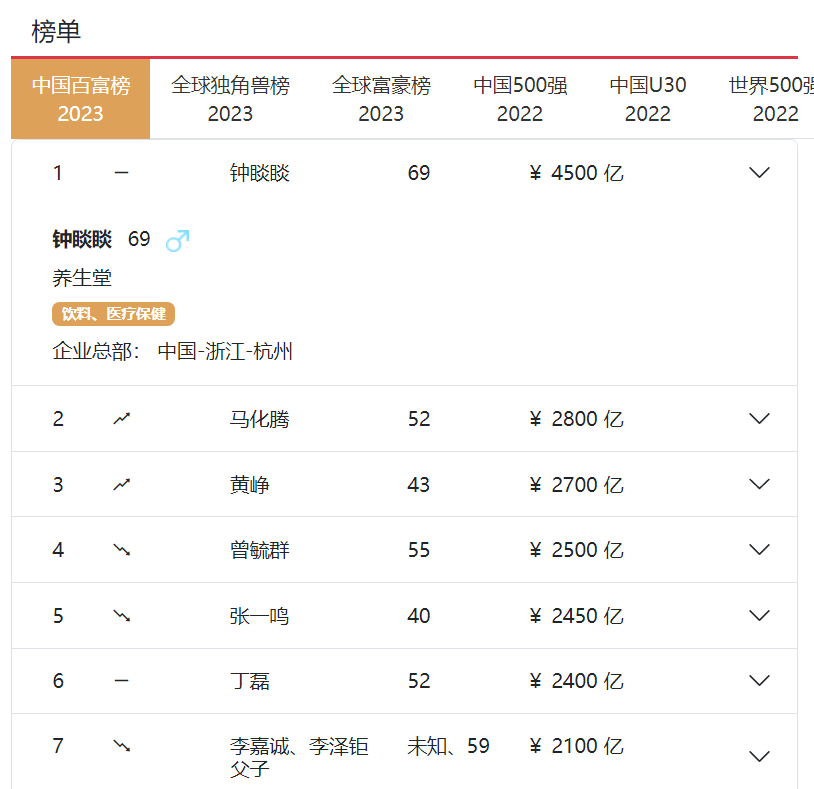 值得一提的是,今年5月,新财富官网发布了《2023新财富500富人》榜单,钟睒睒以4562亿元财富成为第一名,较第二名今日头条张一鸣财富的3105亿元多出1457亿元。