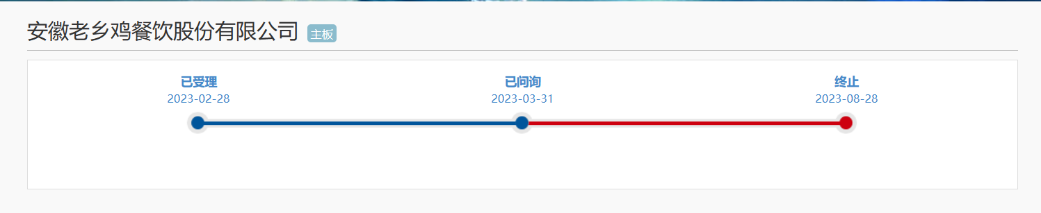 2022年5月19日,老乡鸡在证监会网站披露招股说明书,拟在上交所主板上市;2022年10月28日,老乡鸡更新招股书;2023年2月28日,上交所受理了老乡鸡在沪市主板IPO的申请;3月31日,收到上交所首轮问询;8月28日,老乡鸡沪主板IPO审核为“终止”状态,终止审核的原因是,公司及其保荐人国元证券撤回发行上市申请。回顾此次老乡鸡IPO之旅,历时15个月,老乡鸡第三次冲击上市终究以失败告终。