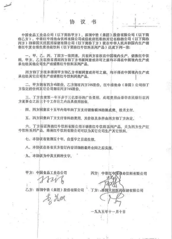 按照中国红牛方面的说法,在1995年,中泰双方开始合作的时候曾签订了一份“50年协议书”。按照协议,只有中国红牛有权在中国境内生产、销售红牛饮料,其他方在获得书面许可或同意前均不得销售。第七条则注明,协议有效期五十年。