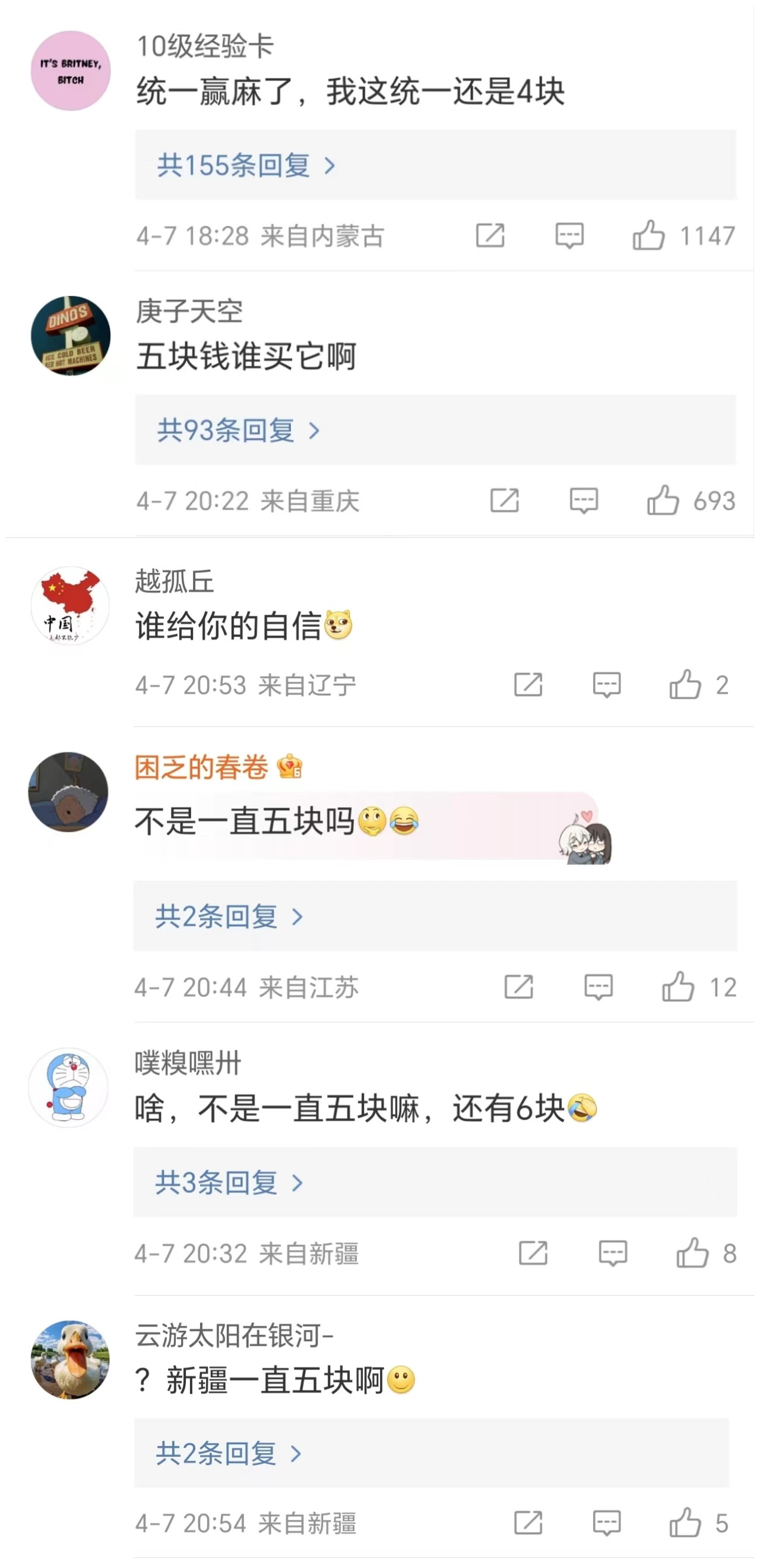 对此,有网友评论称,“统一赢麻了,我这统一还是四块”“五块钱谁还买它啊”“谁给你的自信”。还有网友疑惑,“不是一直五块嘛,还有6块”“新疆一直五块啊”。