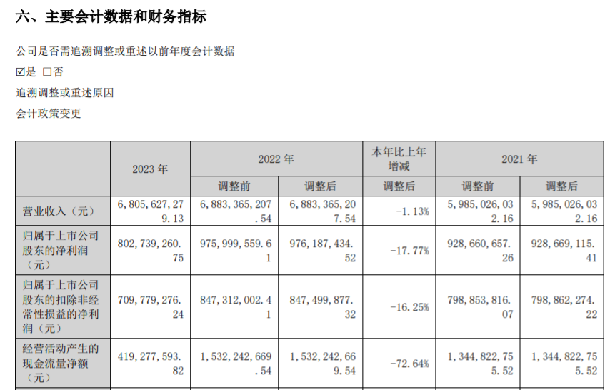 报告期内,洽洽食品营收68.06亿元,同比下降1.13%;归属上市公司股东的净利润8.03亿元,同比下降17.77%;扣除非经营性损益后的归属于上市公司股东的净利润7.1亿元,同比下降16.25%;营业利润8.96亿元,同比下降20.06%;利润总额9.94亿元,同比下降18.53%。