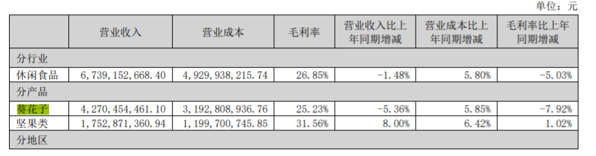 作为业绩“支柱”,洽洽食品的葵花子业务也开始走“下坡路”。2023年,洽洽食品旗下葵花子业务的毛利率为25.23%,较上年同期减少了7.92%。