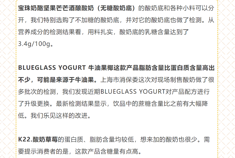 2024年3月,上海市消保委对宝珠奶酪、Blueglass、K22、茶酪酪等现制酸奶产品进行检测。结果显示,除宝珠奶酪样品“用料扎实”外,其余样品均存在不同程度的问题,比如含糖量高、脂肪含量明显高于蛋白质。