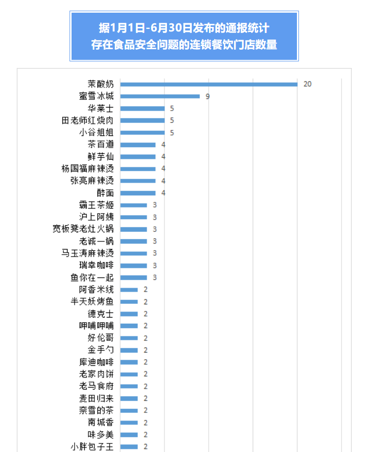据1月1日-6月30日发布的通报统计,2024年上半年茉酸奶存在食品安全问题的连锁餐饮门店数量共有20家,蜜雪冰城9家,茶百道、鲜芋仙、杨国富麻辣烫等均有4家,霸王茶姬、瑞幸、沪上阿姨、老城一锅等有3家,另外还有半天妖烤鱼、库迪咖啡、南城想、CoCo都可、比格、南京大排档、米村拌饭等均有1-2家涉事门店。
