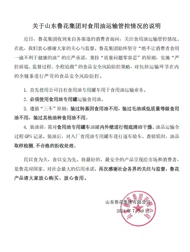 鲁花集团在说明中指出,公司始终坚守“绝不让消费者食用一滴不利于健康的油”的承诺,秉持“质量问题零容忍”的原则,实施“严控前端、监督过程、全程追溯”的食品安全风险防控策略,对包括运输环节在内的全链条进行严苛的食品安全风险防控。
