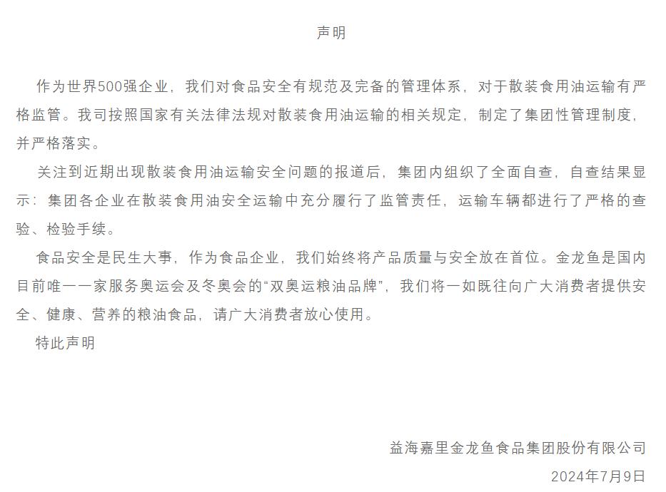 金龙鱼则发布声明称,作为世界500强企业,对食品安全有规范及完备的管理体系,对于散装食用油运输有严格监管。公司按照国家有关法律法规对散装食用油运输的相关规定,制定了集团性管理制度,并严格落实。关注到近期出现散装食用油运输安全问题的报道后,集团内组织了全面自查,自查结果显示:集团各企业在散装食用油安全运输中充分履行了监管责任,运输车辆都进行了严格的查验、检验手续。