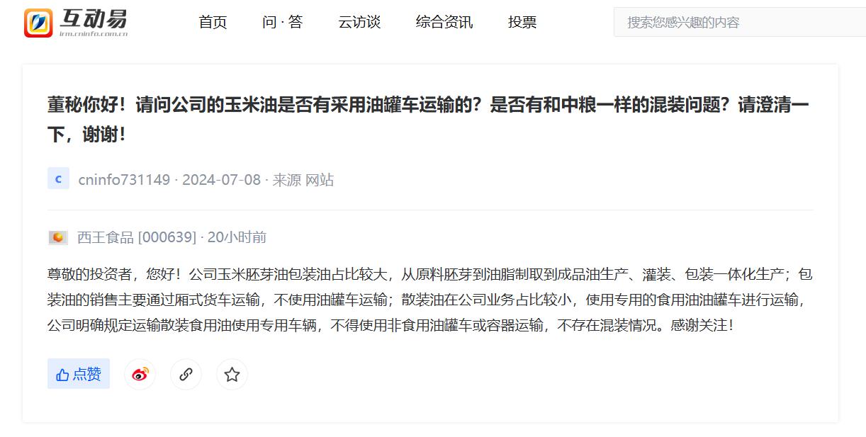 7月9日下午,西王食品在互动易平台表示,公司玉米胚芽油包装油占比较大,从原料胚芽到油脂制取到成品油生产、灌装、包装一体化生产;包装油的销售主要通过厢式货车运输,不使用油罐车运输;散装油在公司业务占比较小,使用专用的食用油油罐车进行运输。