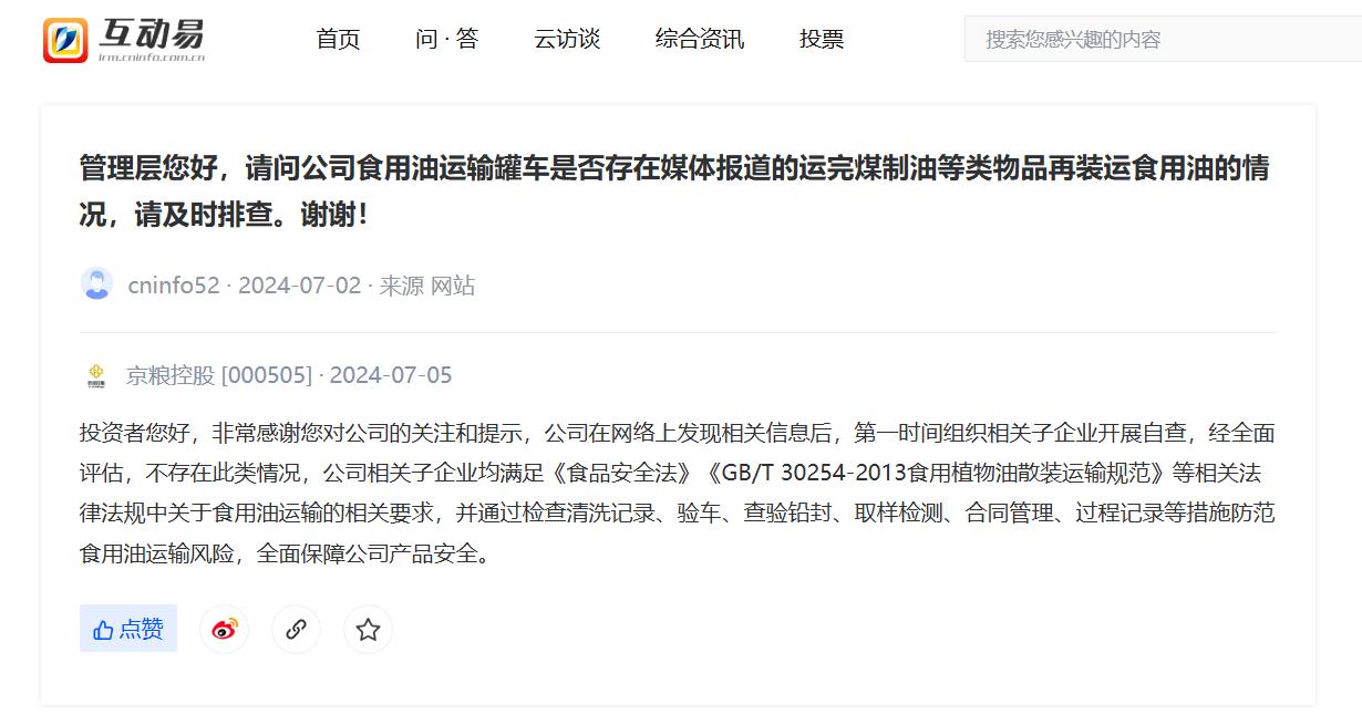 此外,京粮控股近日在互动易平台表示,不存在运完煤制油再装运食用油的情况。