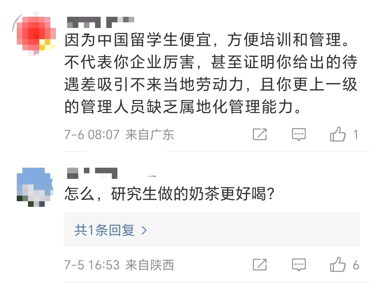 不过,古计林这番言论并未得到网友们的认可,有网友评论称:“因为中国留学生便宜,方便培训和管理。不代表你企业厉害,甚至证明你给出的待遇差吸引不来当地劳动力,且你更上一级的管理人员缺乏属地化管理能力。”