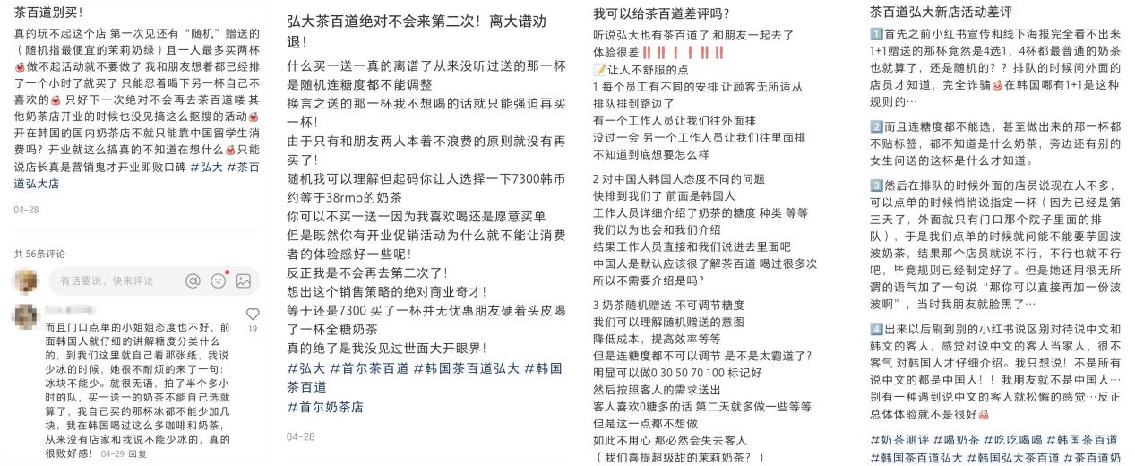在小红书平台,有网友评论称:“茶百道(弘大店)门口点单的小姐姐态度不好,前面韩国人就仔细的讲解糖度分类什么的,到我们这里就自己看那张纸,我说少冰的时候,她很不耐烦的来了一句,冰块不能少。就很无语,排了半个多小时的队,买一送一的奶茶不能自己选就算了,我自己买的那杯冰都不能少加几块,我在韩国喝过这么多咖啡和奶茶,从来没有店家和我说不能少冰的,真的很败好感。”
